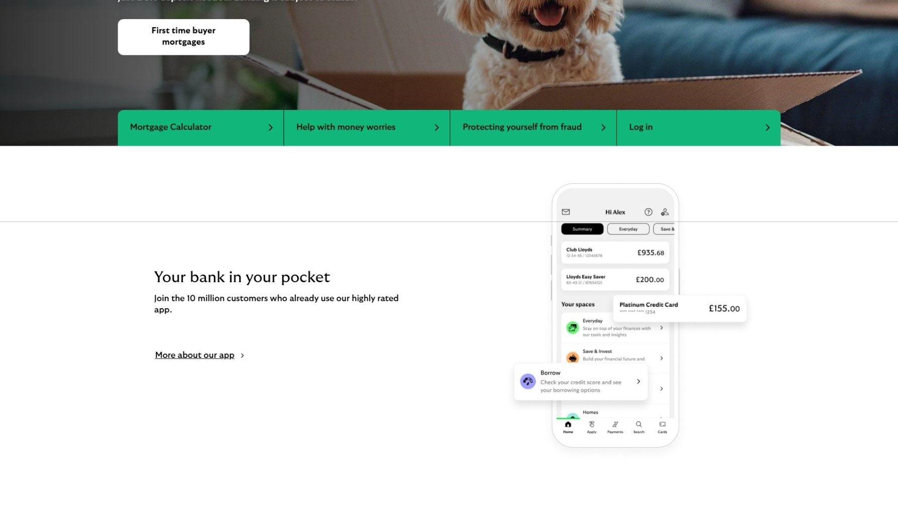 - The app interface is also an opportunity to highlight some of the services that the company is keen for the user to remember. Every part of the UI design flows towards the main offer being made to the user. In Lloyds Bank's case, lending money to first-time house buters. So, the app interface is an opportunity to highlight its lending services: "Borrow" and "Platinum Credit Card".