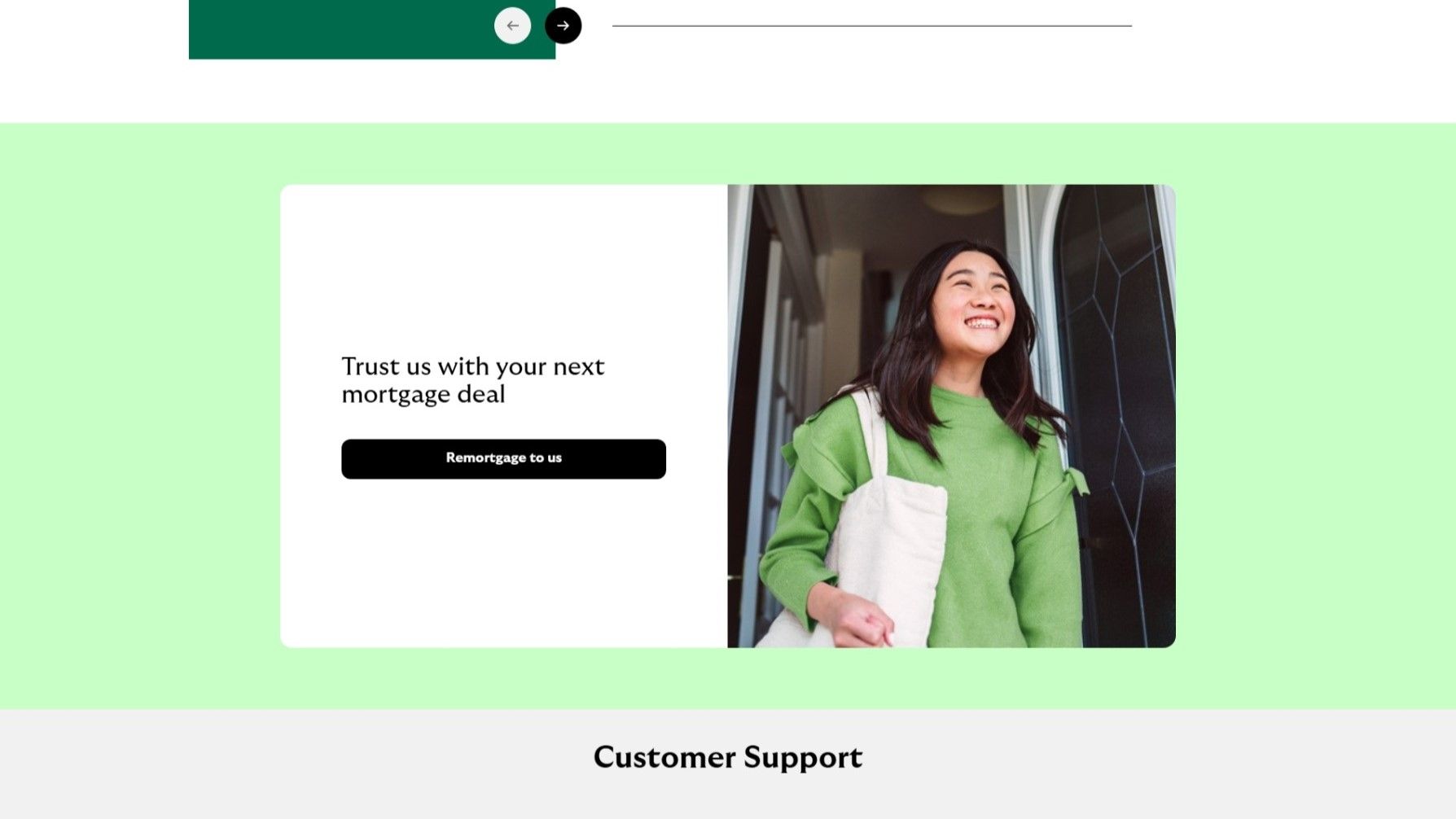 - There's a large photo of beaming young woman leaving a house through the front door, looking ahead and slightly upwards with warm-toned jumper, next to "Trust us with your next mortgage deal". The low angle the photograph is taken from and the upward gaze of the subject lead the viewers' eyes high and to the right. Like a right-facing arrow, this is associated with something new. And something higher is something better. The subject of the photograph is looking out at something better. The natural sunlight and the fact that the subject of the photo is standing at an open doorway also invite associations of a new venture. The bright colours, large jumper, and hip tote bag evoke feelings of comfort, youth, vigour, and optimism.