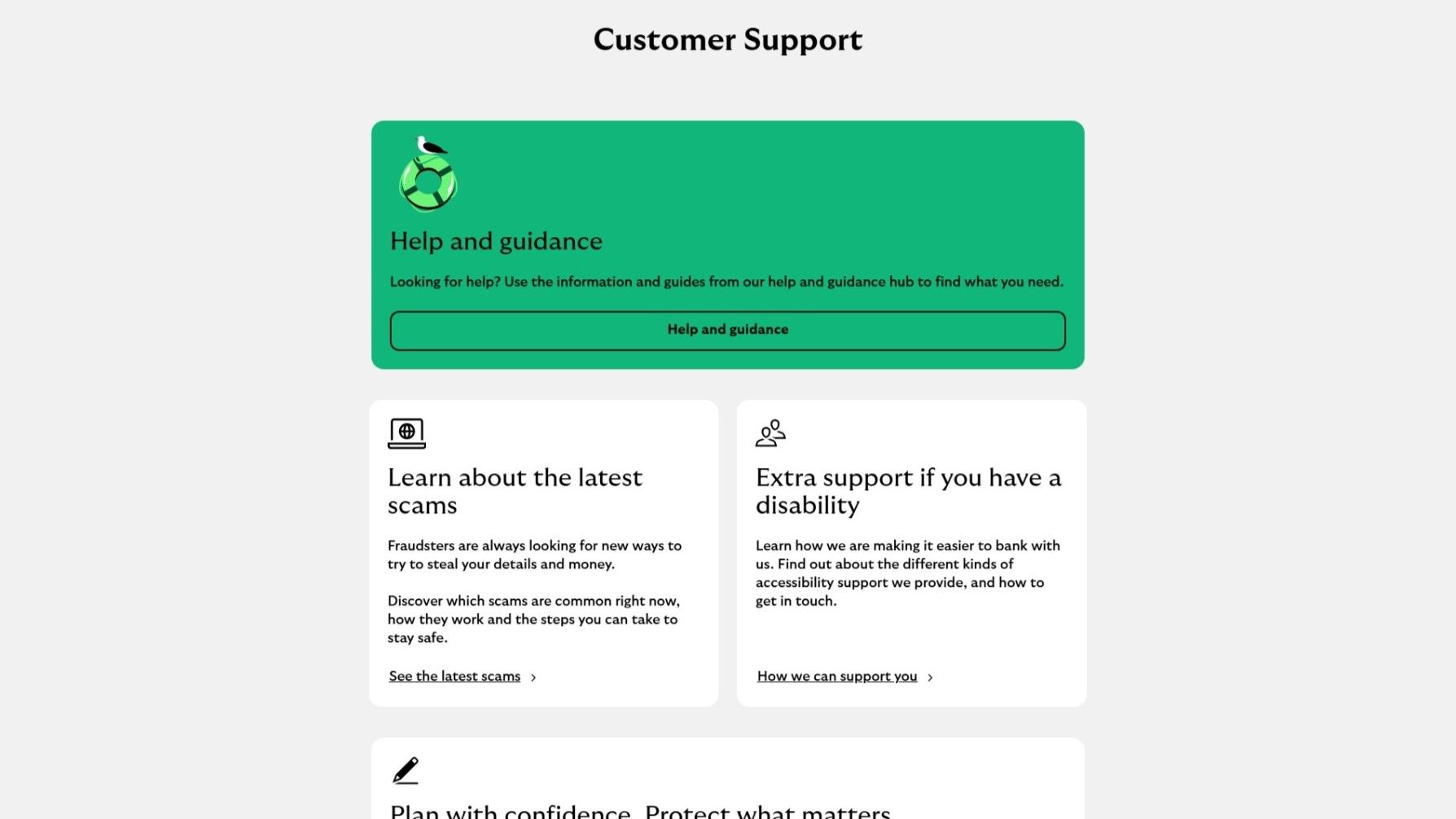 - There's a large section of the website dedicated to "Customer Support". The largest subsections is highlighted in green - an inviting colour, and features an icon of a seagull on a life ring. The image brings some levity to the consumer decisions a user is being asked to consider. It's followed up with the question: "Looking for help?", phrases earnestly and conversationally.