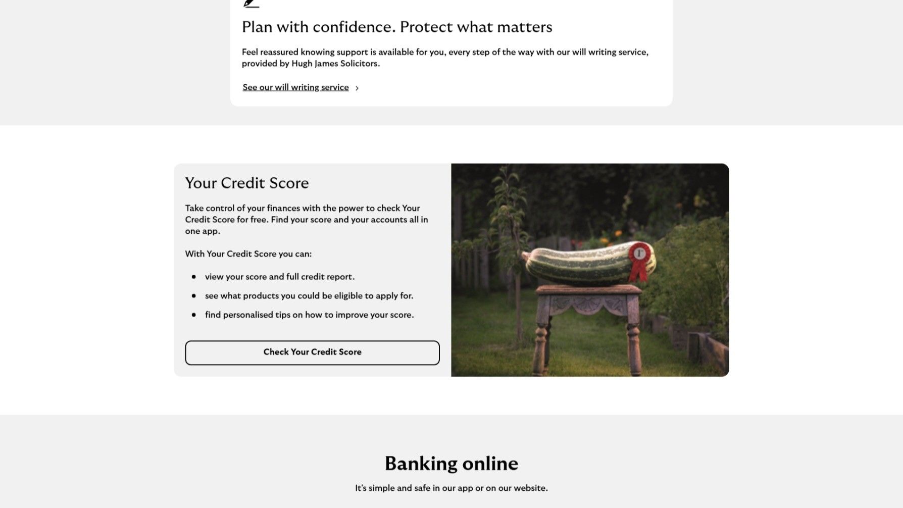 - The photo of an over-sized zucchini on a stool in a vegetable patch garden with a red "1st Prize" ribbon next to "Your Credit Score" is a great follow-up to the support section. It carries on the levity of the seagull image with a picture that, while comedic, also evokes the nostalgia of old, green England with its grannys and country-farms. It's wraps all the way back round to the homely, familiarity of the dog at the start.