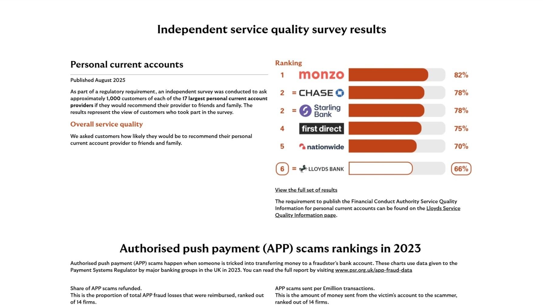 - The page includes a "Independent service quality survey results" section near the bottom of the page. Rankings help users determine whether to use a business, just like ratings. And although Lloyds Bank is not in the top five of the ranking, just their presence on what reads as an independent survey of customer satisfaction adds to their perceived legitimacy. It feels like the sort of ranking an established bank would be on, regardless of their actual rank. Of course, it does help that they are number 6 on the ranking, and not at a lower rank.