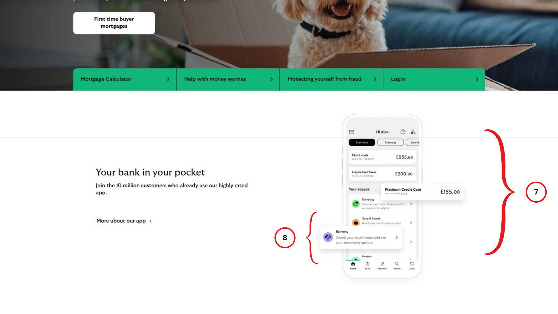 - Using your app interface in your website design does several things. It sets a realistic expectation for the user in how they will be using the product. It ensures there are no surprises during the user journey. In this case, Lloyds Bank is highlighting how the practical experience of their services will be through an mobile application. On a deeper level, it makes Lloyds Bank seem helpful to a prospective customer. They've predicted their queries and are immediately walking them through the process of using their services. It also subtly moves past the whether the user will become a customer, and starts showing them what perks they'll have access to as if they had already agreed to sign on.